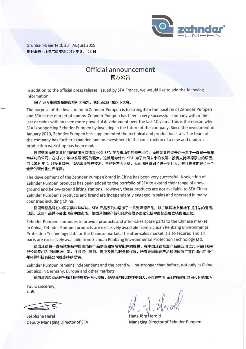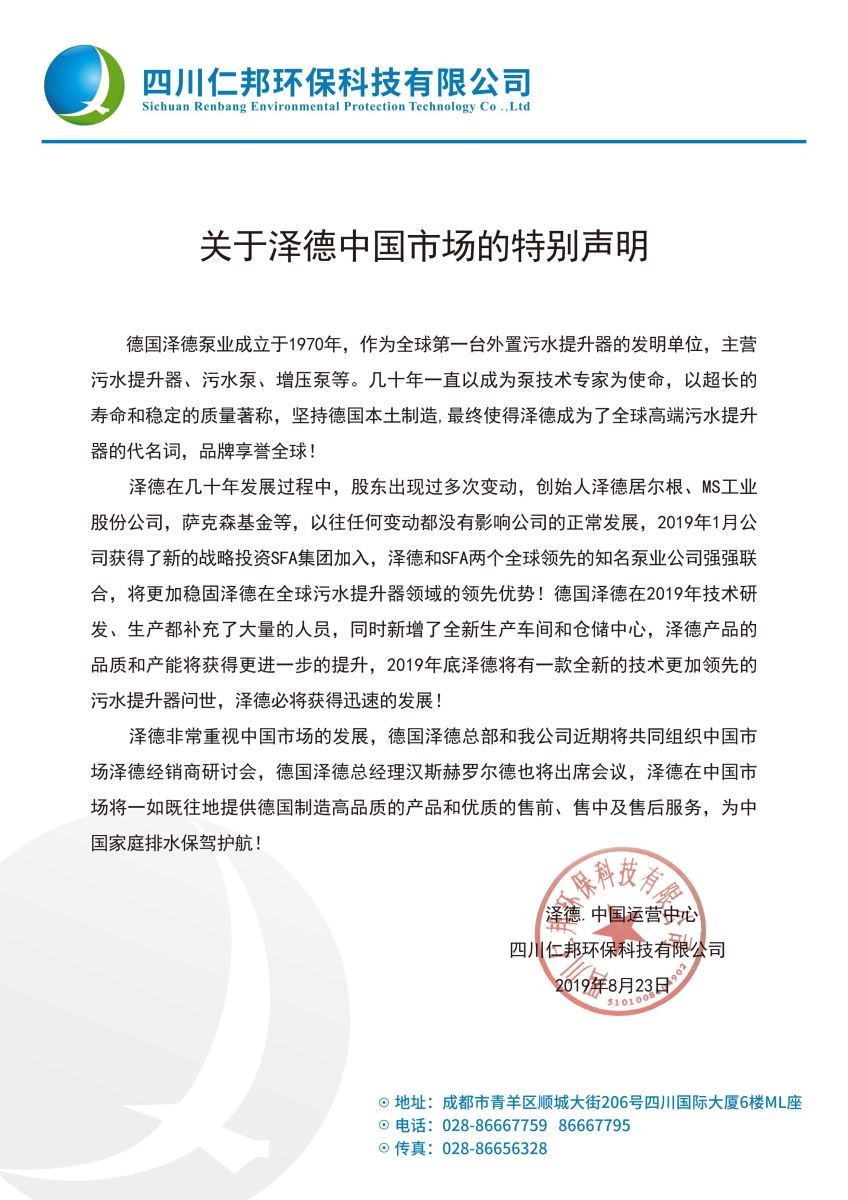 近期中国污水提升市场一些别有用心之人,捏造事实,虚假造谣,蛊惑欺骗客户。针对中国市场,德国泽德总部和仁邦公司联合做出以下声明文件,同时对一些虚假造谣之人,保留追究法律责任的权力,特此声明!.jpg)