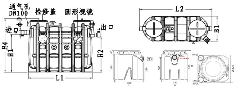 产品特点:泽德油水分离器采用PE箱体 耐腐蚀 紧凑的椭圆形设计 理由油脂分离和沉降,设有圆形视镜和检修口等