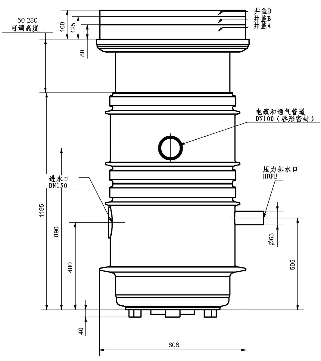 •1个DN150的进水口,适用于PVC管,另外可以在配件选择额外的连接配件